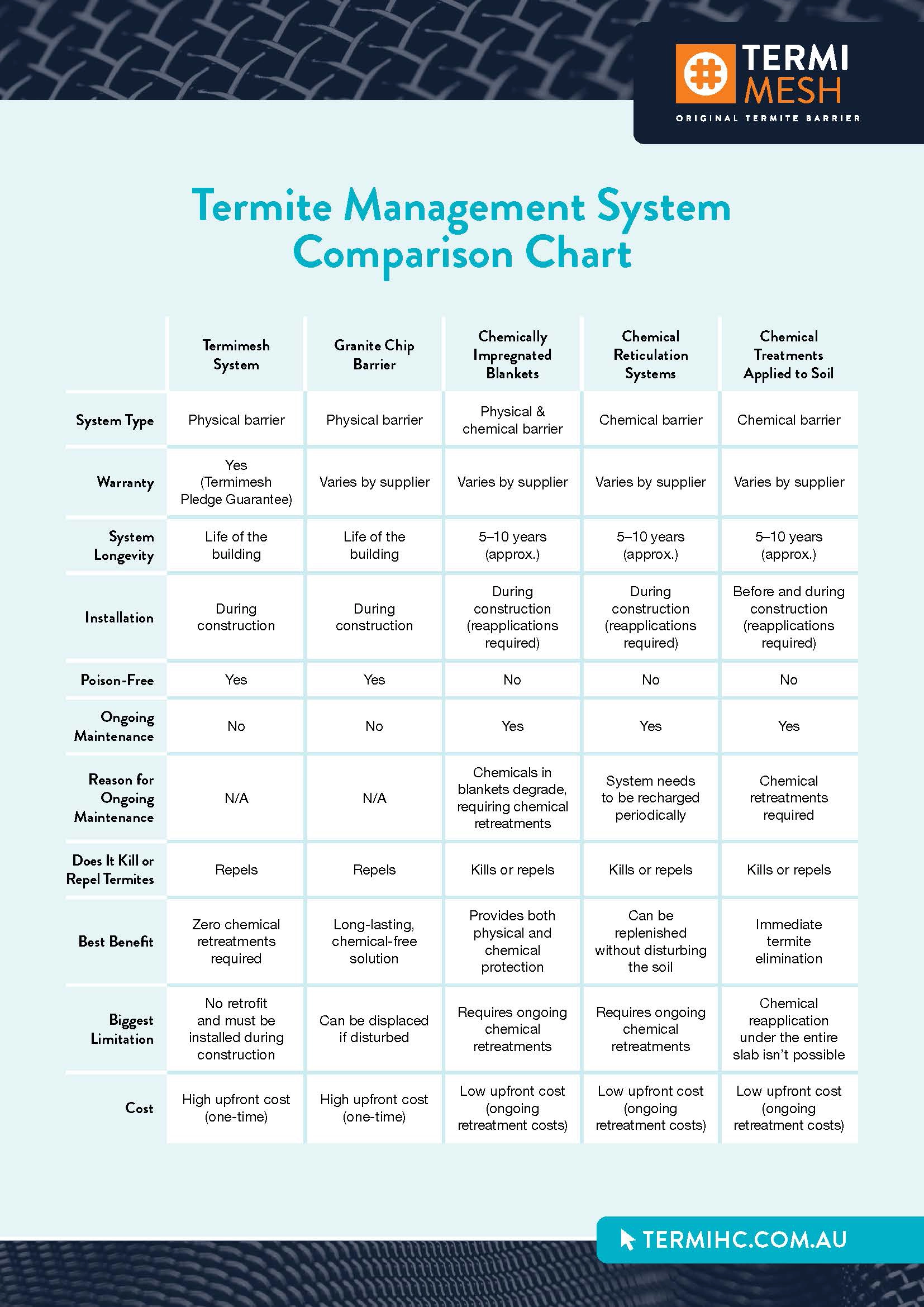 The table below compares the Termimesh System against alternative termite management systems available on the market to Australian homeowners. To learn more about termite management systems, read our recent blog.